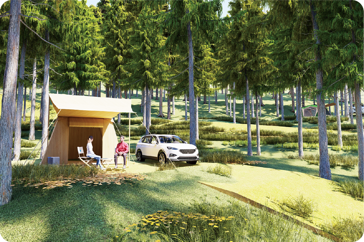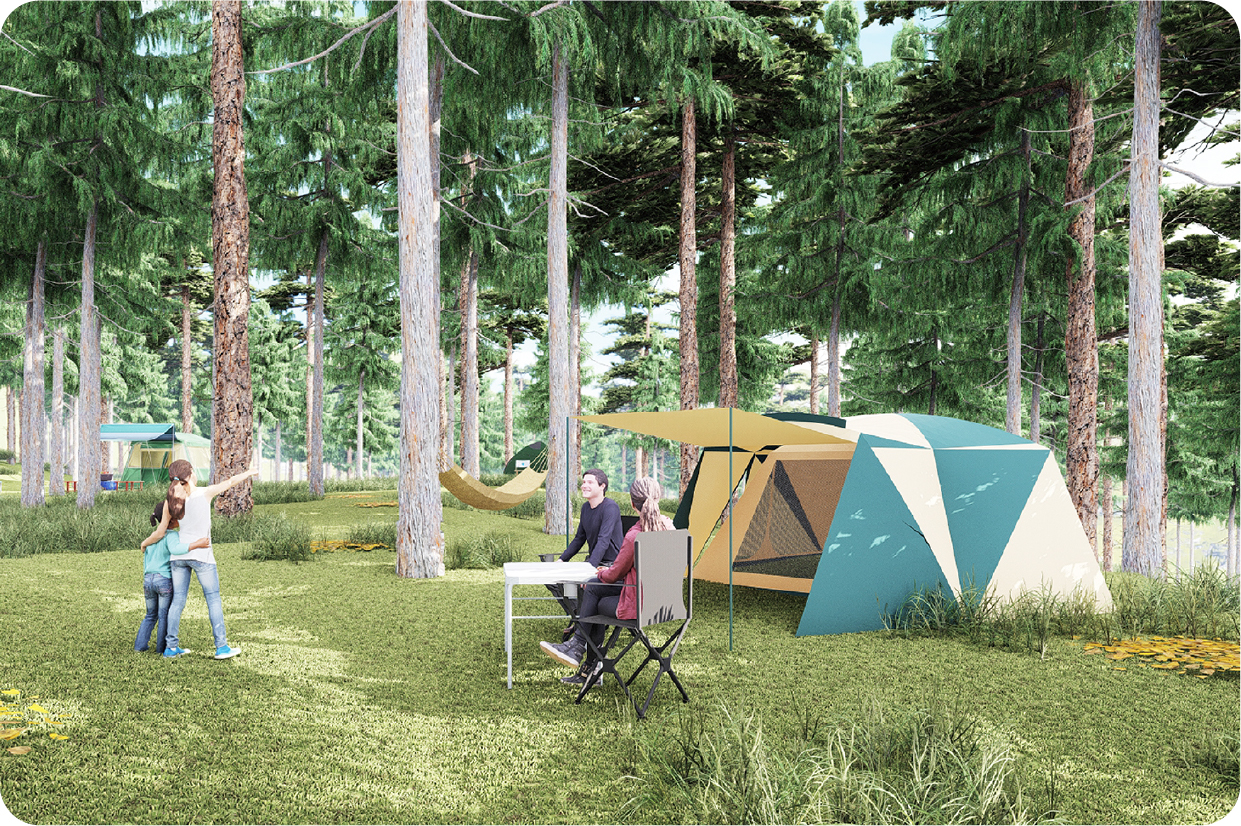 キャンプ場サイト内を広々と利用できるフリーキャンプサイトとして、10個程度のテント設営を予定しています。テント1か所あたり80㎡程度を想定しています。林間サイトとして、木漏れ日が美しいところや、既存の樹木を活かしてハンモックを使用できるなど、来場者にとって長王の自然と余暇を満喫できる場所になることでしょう。