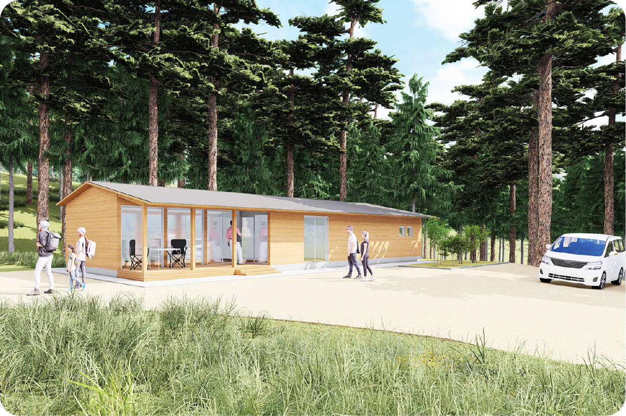 キャンプサイト出入口付近に施設の管理運営のための管理棟(100㎡程度)と駐車スペース(280㎡程度)を計画予定です。森林の中に建つ建物のイメージとして、木部をあらわしとした、木造平屋の建物を予定しています。