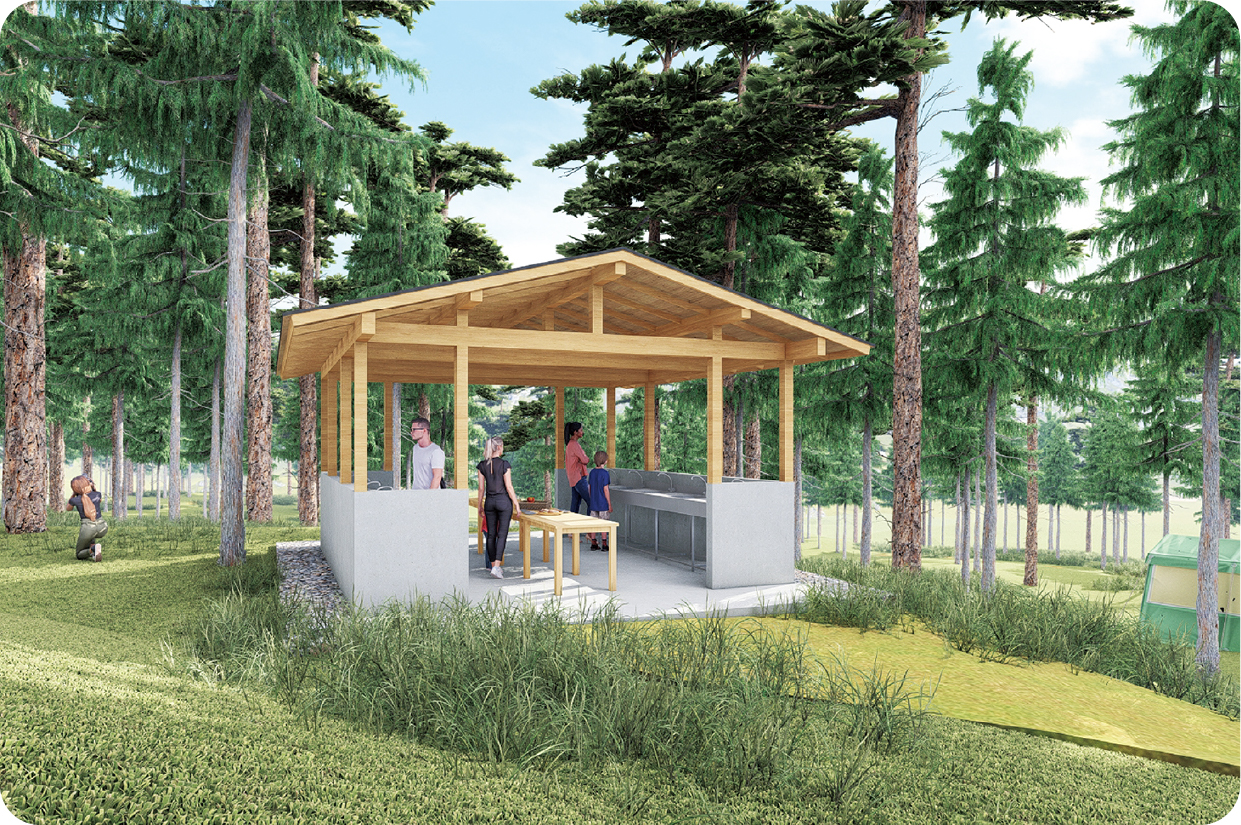 キャンプ場内の森林を清潔に保つ意味も込めて炊事場、トイレ施設、シャワー施設を計画予定としています。それぞれの施設は、管理棟同様に森林の中に建つイメージとして木部をあらわしとした、木造平屋の建物を予定しています。